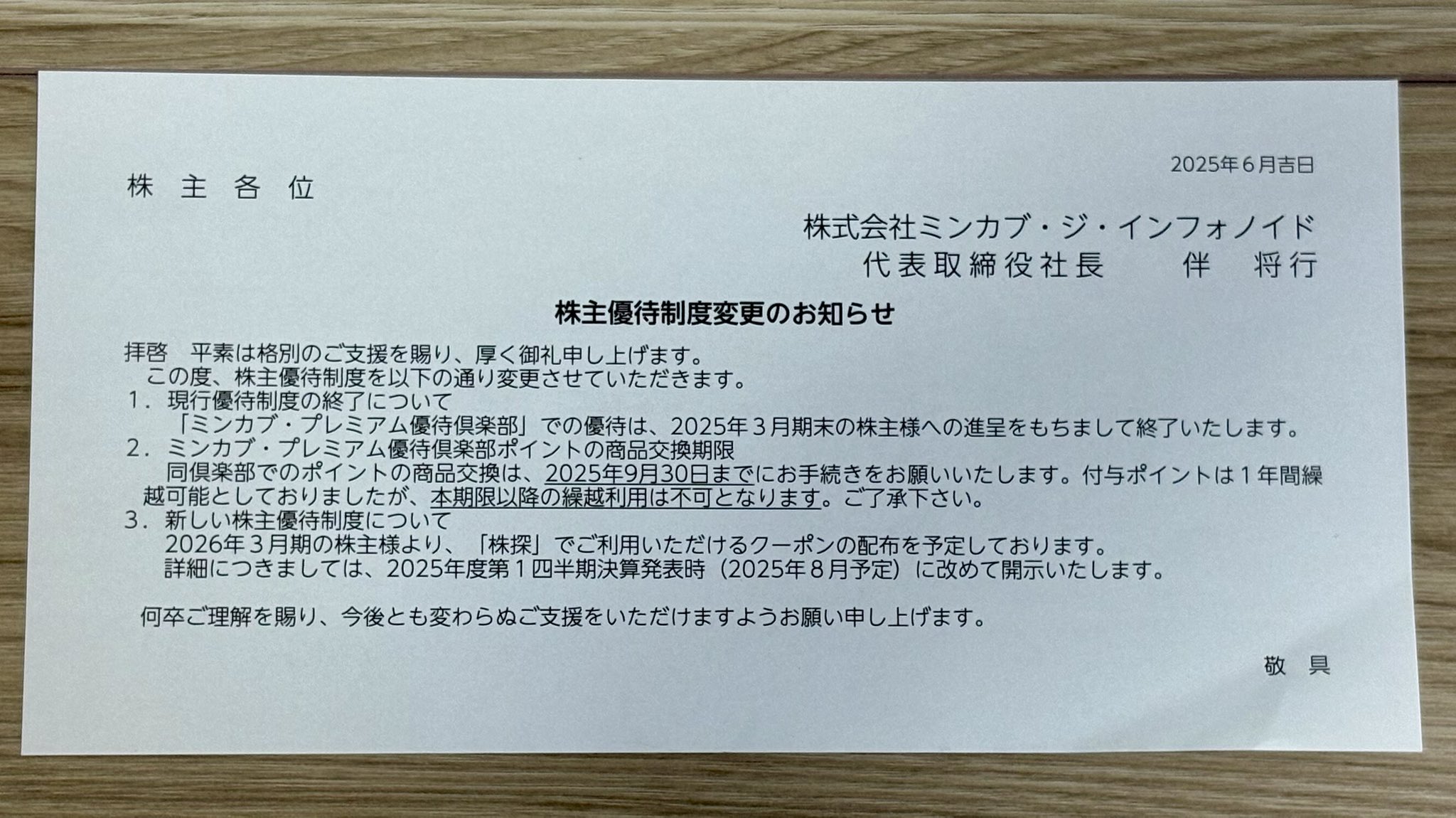 『みんかぶ』『株探』などのメディア運営と法人向け情報サービスを展開しているミンカブ・ジ・インフォノイドが株主優待を変更します。