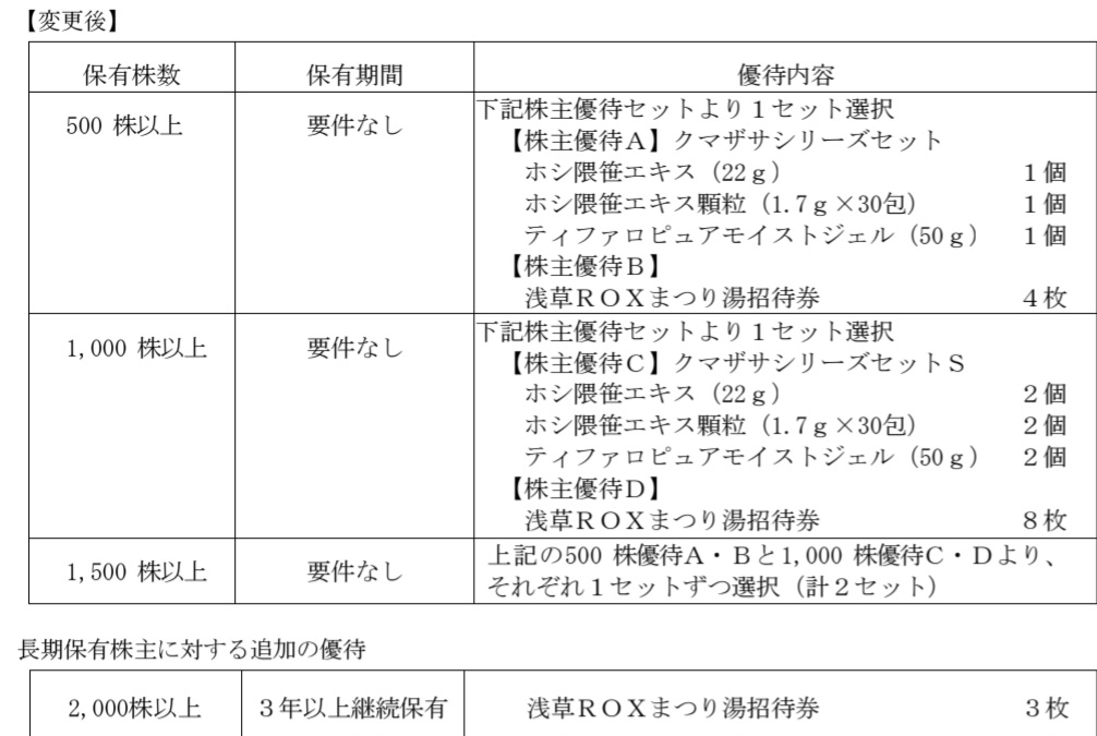 1,000~1,499株 | 以下より1セット選択 Aセット:ビューティーサポートセットS Bセット:クマザサシリーズセットS Cセット:浅草ROXまつり湯優待券 8枚 |