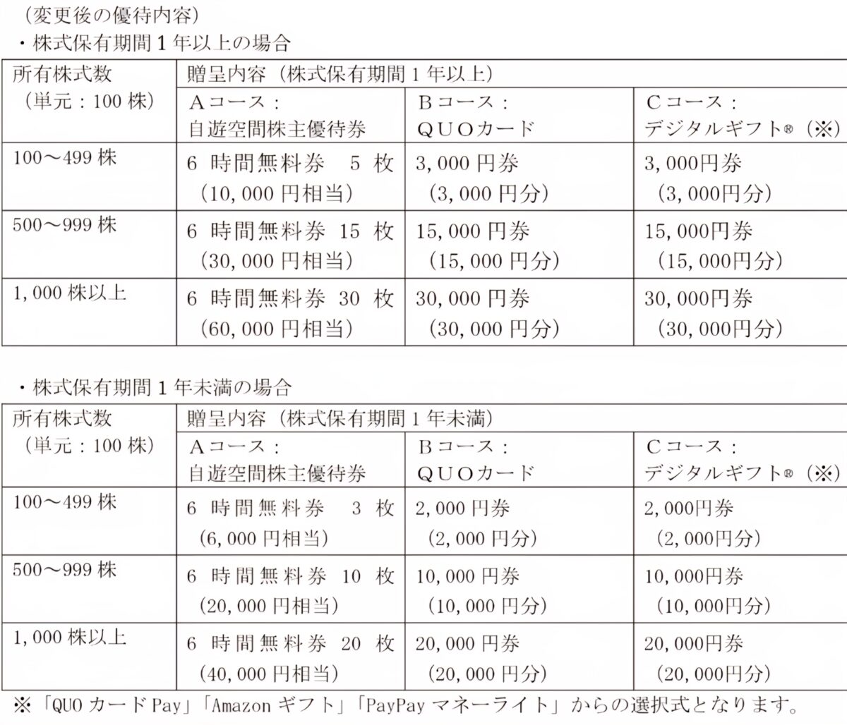| 100~499株 | 自遊空間 6時間 無料券 3枚 6000円分 またはクオカードor アマギフ 2000円分 |
