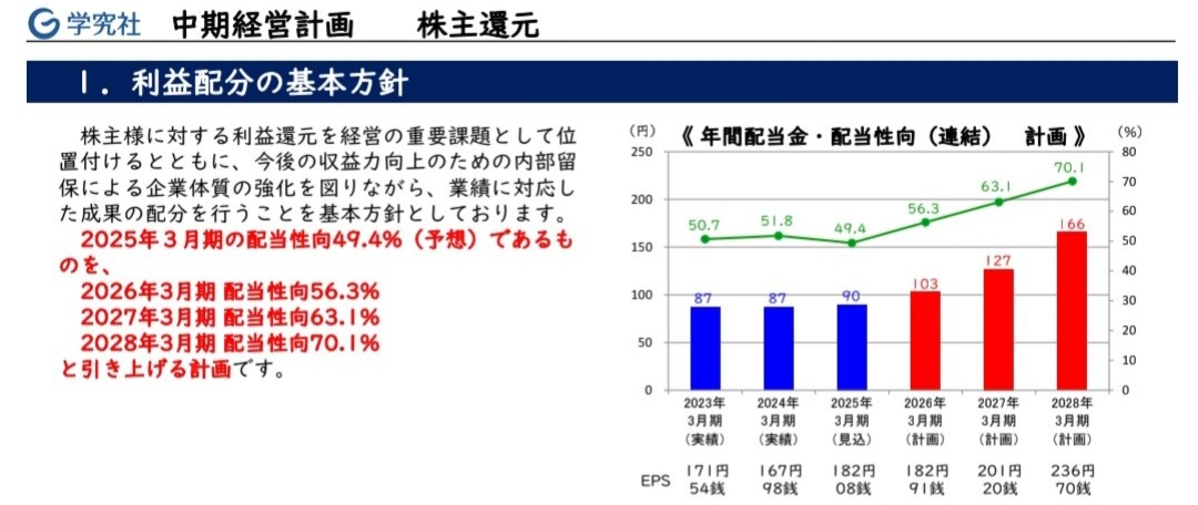 最新の中期経営計画によると、2028年3月期は配当性向 70.1%に引き上げる計画となっています。