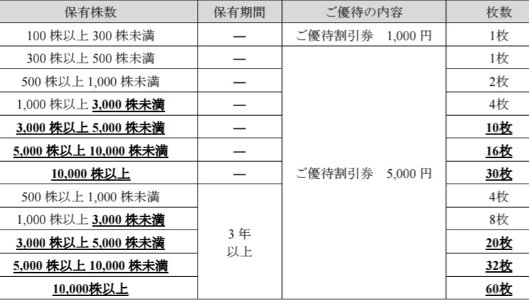 | 1,000株以上 | 3年未満:5,000円券 (4枚) 20,000円分 3年以上:5,000円券 (8枚) 40,000円分 |