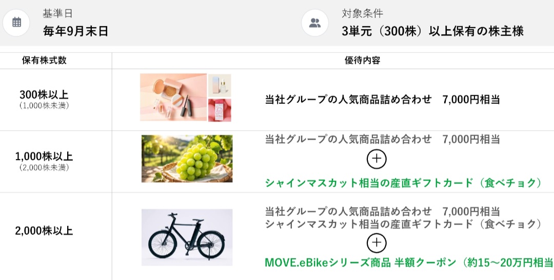 | 2,000株以上 | 商品詰合せ 7,000円相当 シャインマスカット相当の 「産直ギフトカード」 8,000円分 MOVE.eBike 半額クーポン (15万円〜20万円相当) |