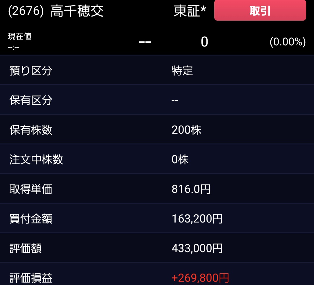 株を購入してから順調に株価が上昇し、現在は約27万円の含み益となっています。