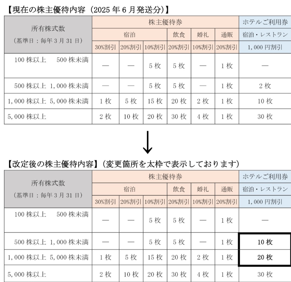特に500株・1,000株保有区分でホテル利用券が増額となり、注目度アップです。